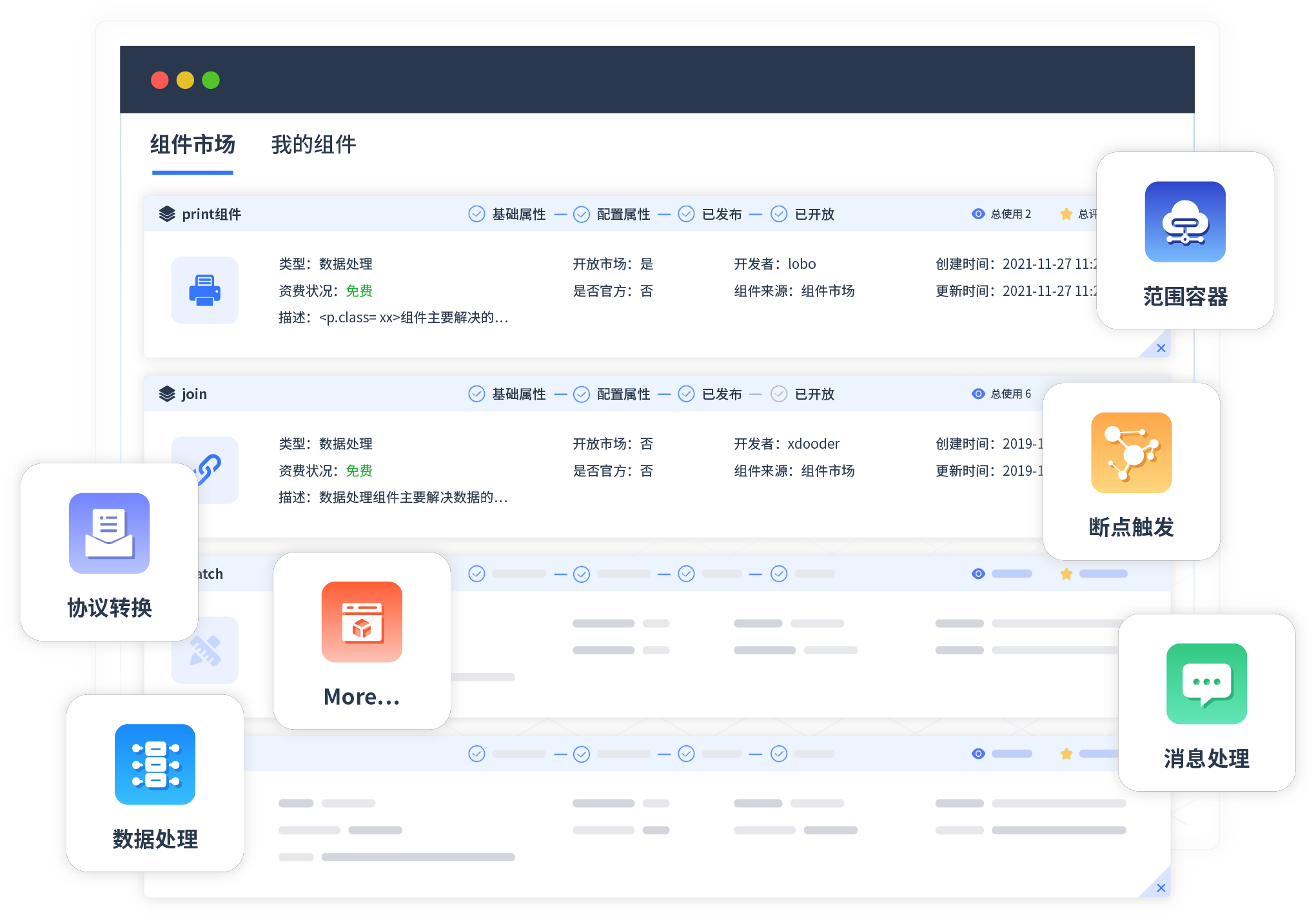 针对集成场景,南宫28圈地址新版提供组件市场,例如协议转换、消息处理、文件操作等。除平台提供的组件外,客户可以自定义所需组件。